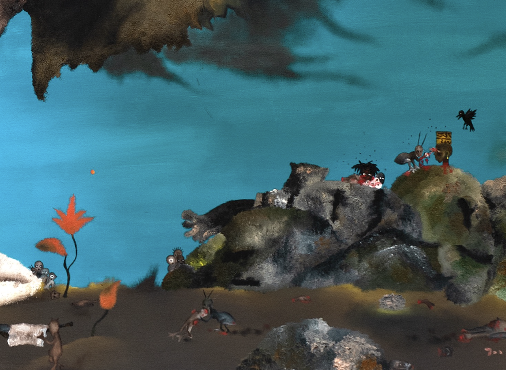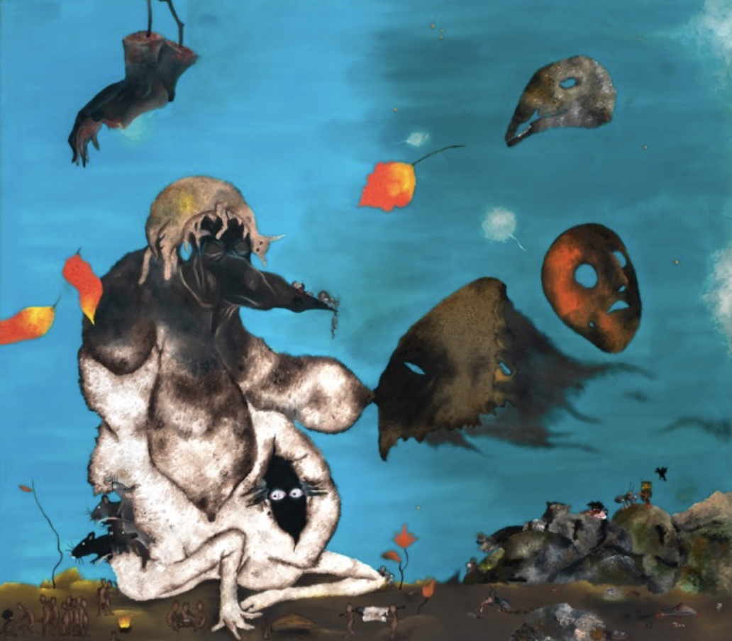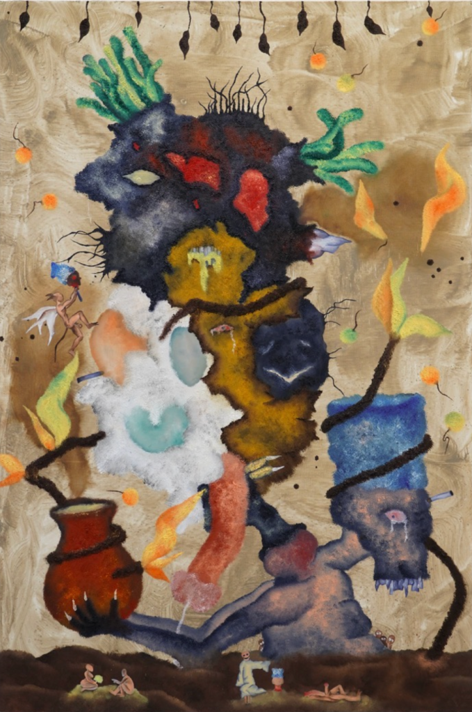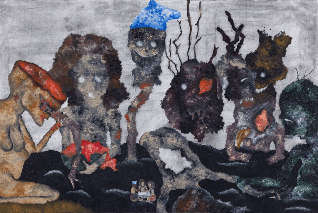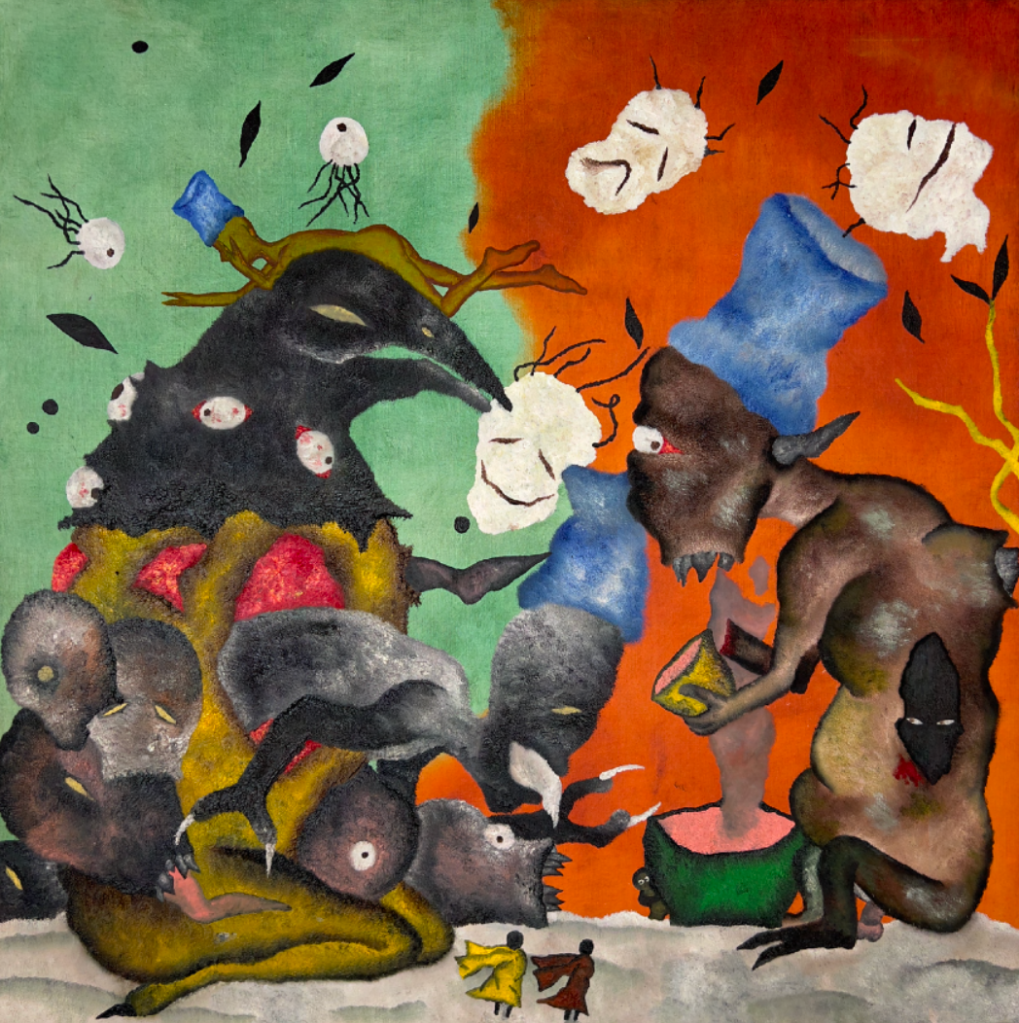 Lorsque l’on s’intéresse au détail de chaque peinture, on remarque qu’à côté de cette scène « primaire » se déroule une autre histoire. Prenons l’exemple de la toile ci dessous intitulée « Entre nous« . On remarque ces entités, se dévorant, sur un sol qui parait mouvant comme la mer, que l’une de ces entités porte sur sa tête un kofia, accessoire quotidien de Merveille, souvent retrouvé sur ses tableaux. Au bas centre de la toile, on voit trois silhouettes humanoïdes en cercle, « entre elles », réunies autour d’une table, comme appartenant à un second plan.