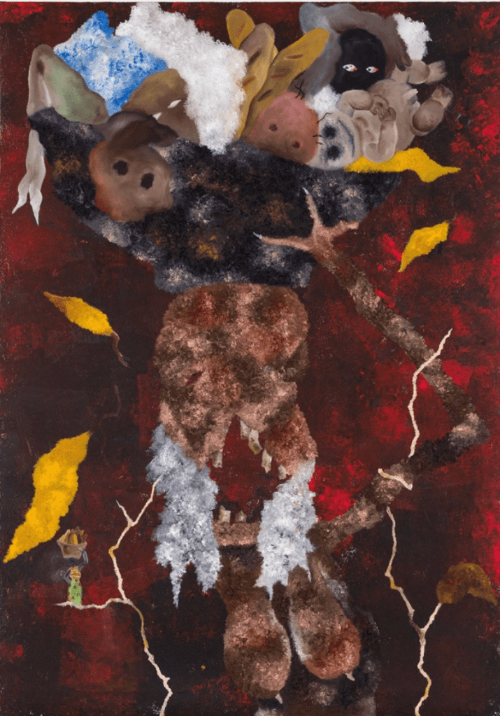 La toile ci dessous est une bonne démonstration de ce prisme d’observation. On y voit la vendeuse de pain, qui a donné son nom au tableau, représentée à deux occasions. L‘entité primaire qu’on remarque de suite, imposante, portant un panier sur sa tête avec des baguettes de pain et d’autres éléments souvent retrouvés sur les toiles de Merveille comme une entité vêtue d’un kofia. Mais en bas à gauche on voit de la même manière que dans la toile discutée précédemment, une seconde représentation de la vendeuse de pain, plus petite, plus humanoïde.