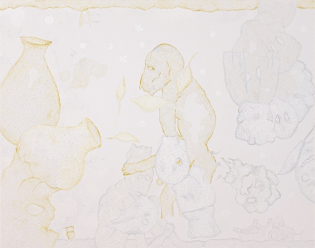 Initialement inspiré des histoires que lui contait son grand père, Merveille peint des entités énigmatiques sur des fonds dont on peine à situer la nature. Ainsi, ce qui attire l’oeil de prima bord sont ces silhouettes intrigantes. Tout comme le fond, leur expression est incertaine. Elles semblent stupéfaites, peut être. Certaines ont des yeux, d’autres non. Certaines esquissent un sourire, d’autre ne laissent pas apercevoir l’ombre d’une bouche. Leur corps est presque volatile.