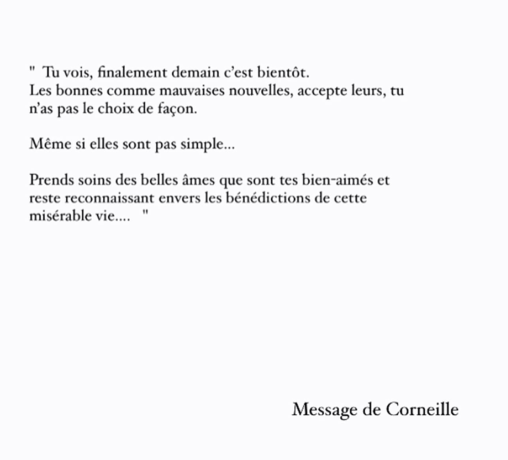 Si vous le suivez sur les réseaux sociaux, vous aurez également la chance de suivre certaines de ses pensées. dont une ci-dessous signée Corneille.