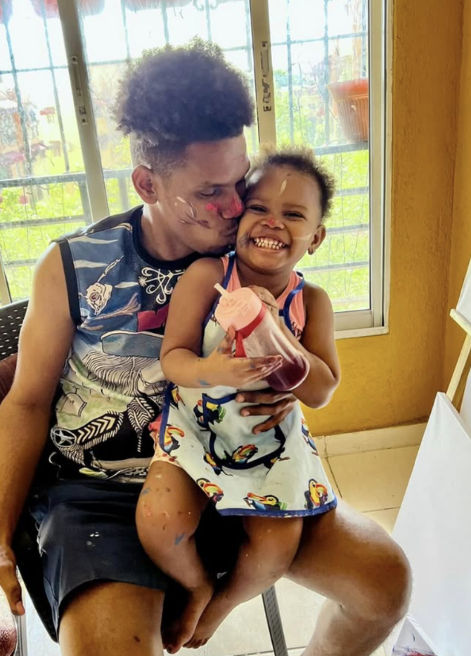 Photo de Lesly Pierre Paul et sa petite fille dans son atelier, 2025. Crédits : Lesly Pierre Paul.