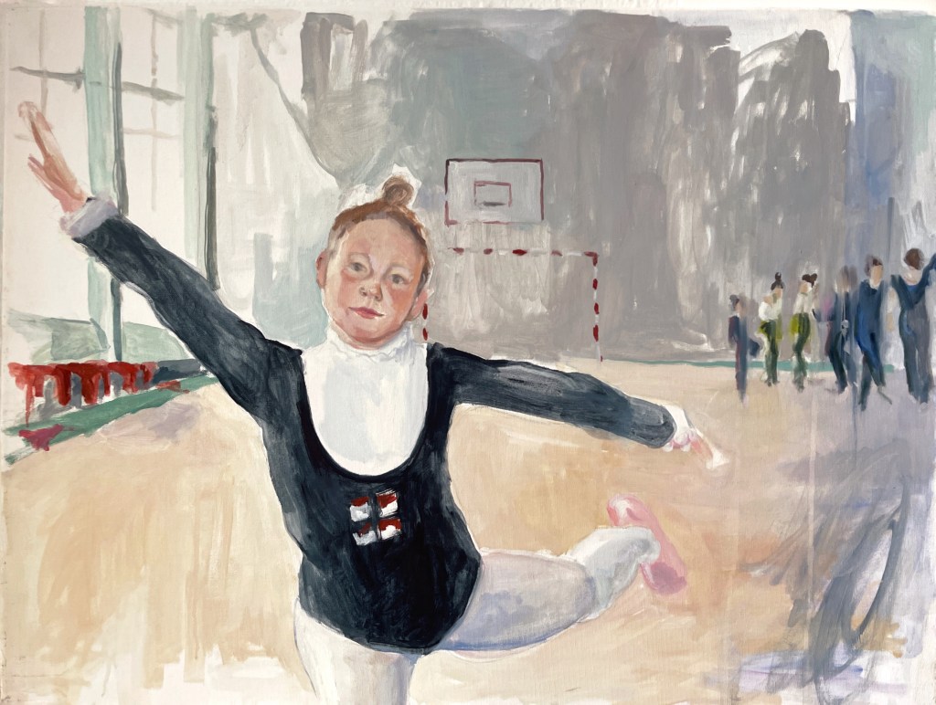 Au sein de l’atelier de Tim Eitel, Yeva explore les moments qui constituent son identité et sa mémoire. Ses œuvres sont empreintes de nostalgie, mais jamais de gravité. Parmi celles qu’elle a eu la gentillesse de me montrer, une petite toile m’a marqué : une jeune fille en tenue de gymnastique.